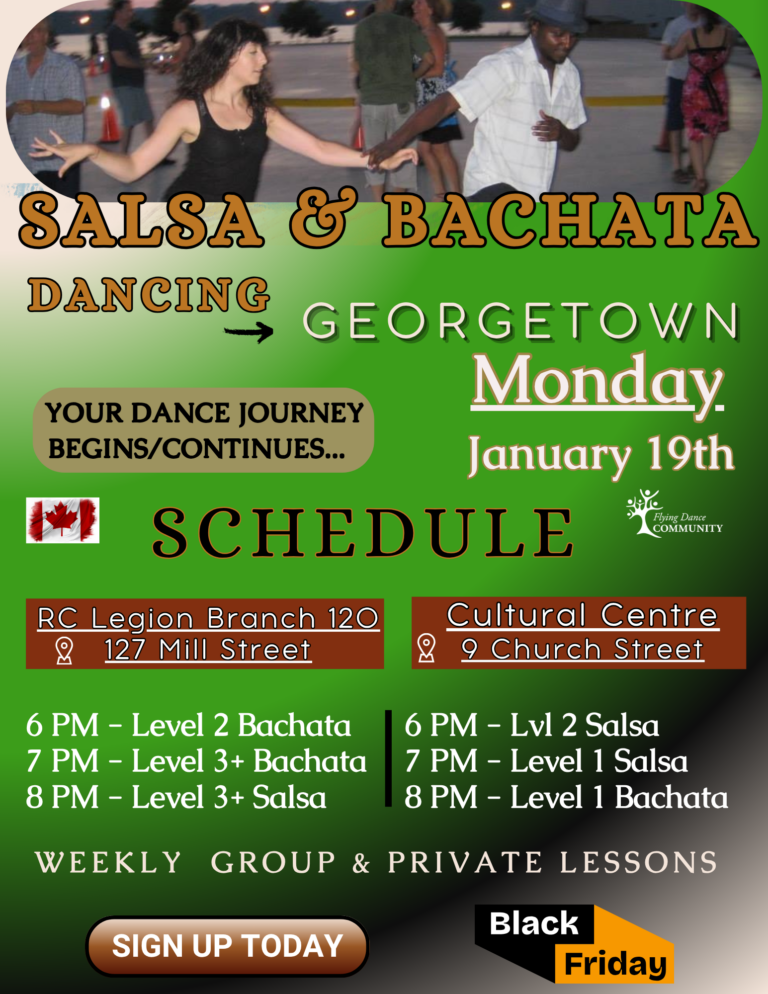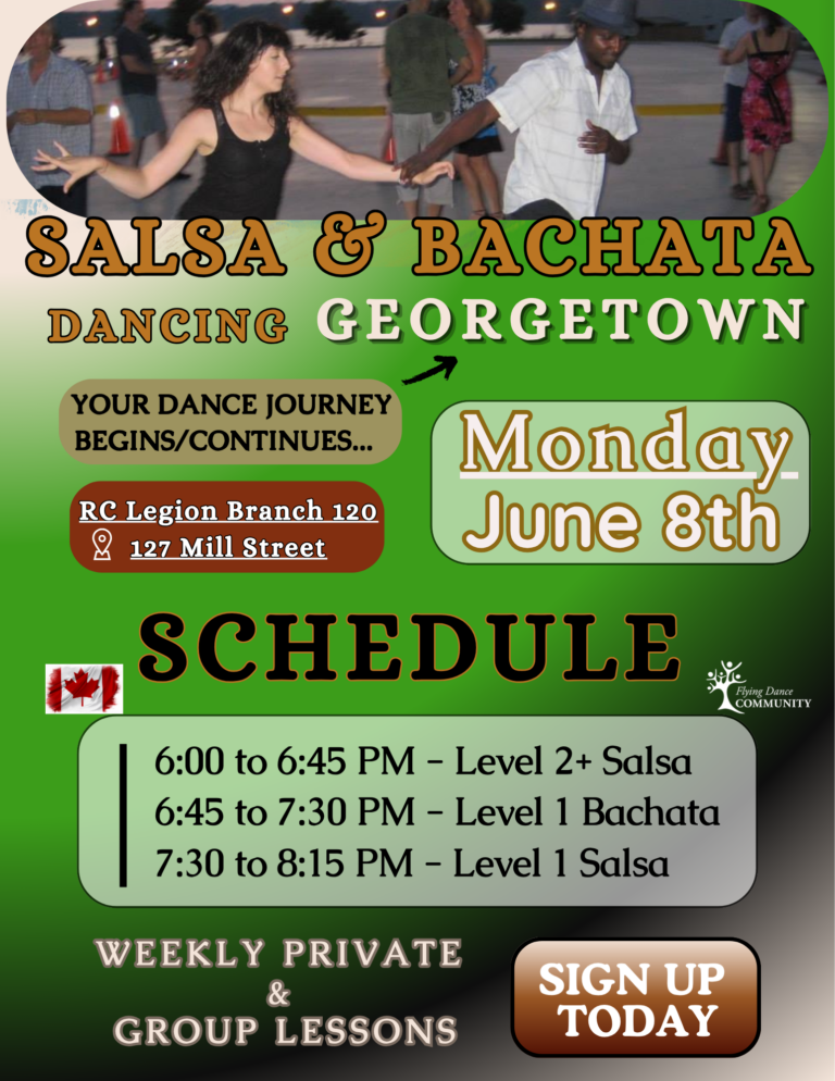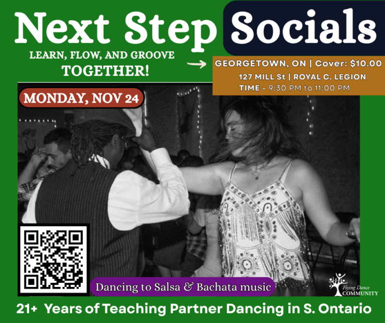 Our story began in 2002 with grassroots socials in downtown Guelph—Latin Fiesta nights at the E-bar, summer Salsa in the Park gatherings, and the annual Flying Dance Festival. These adult dancing events grew into a comprehensive dance education program that’s taught thousands to find their rhythm. Georgetown and Milton were our first bold steps outside Guelph in 2024, and the response has been incredible. We now operate across two venues in Georgetown: the Cultural Centre at 9 Church Street and the Royal Canadian Legion Branch 120.