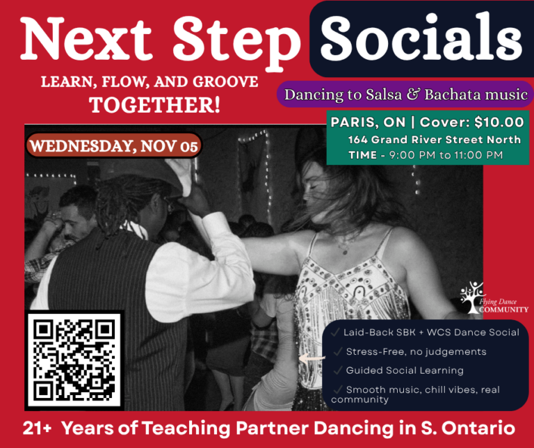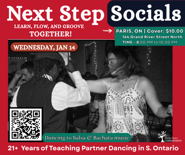After two decades of building Guelph’s premier Latin dance community, Flying Dance Community is thrilled to bring our proven teaching methods and vibrant community spirit to Paris. We launched here in August 2025, bringing the same energy and enthusiasm that’s made our Guelph location the heart of Wellington County’s dance scene to the Grand River community.