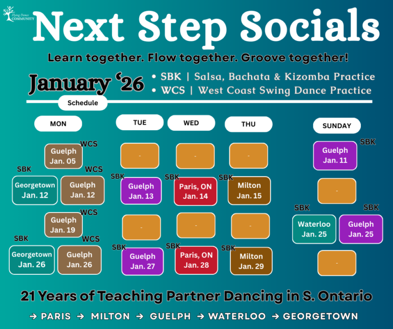 • Next Step Socials (NSS): Relaxed practice sessions included FREE with your class pass. Build confidence between lessons in a supportive environment