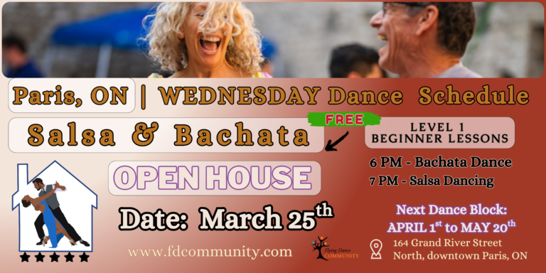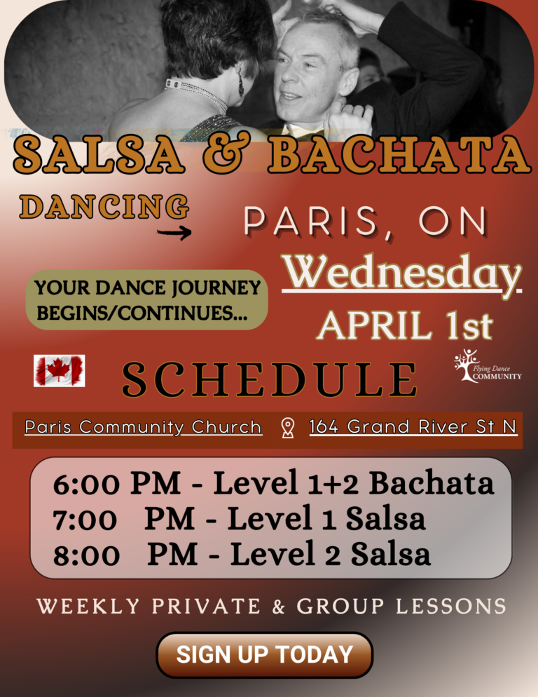 Flying Dance Community brings Latin dance to Paris and the surrounding communities along the Grand River. Whether you’re in town or just outside the city limits, you’re only a short drive from starting your dance journey.