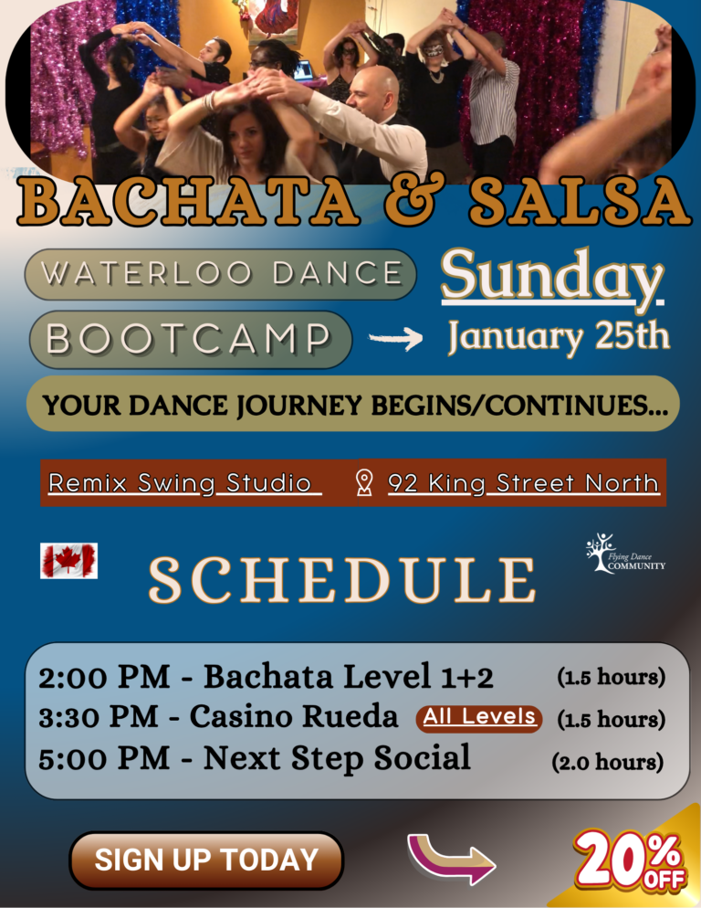 After two decades of building Guelph’s premier Latin dance community, Flying Dance Community is thrilled to bring our proven teaching methods and vibrant community building to Waterloo. We launched here in August 2025, and enthusiasm to redo that’s made our Guelph location the heart of Wellington County’s dance scene.