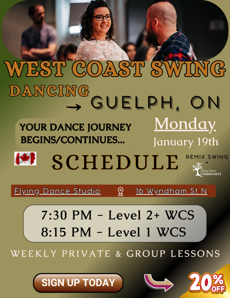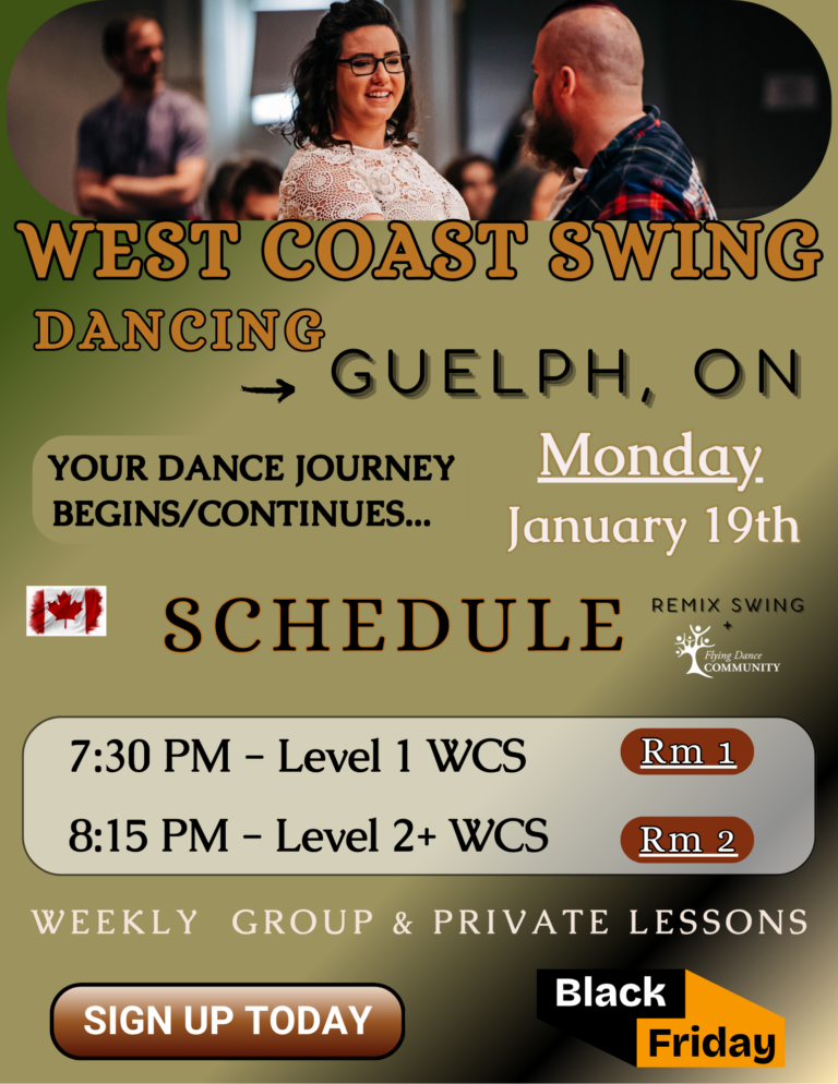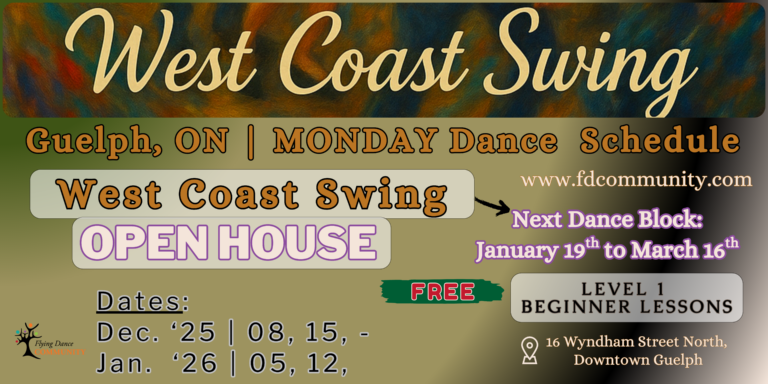 All classes take place at one convenient location: 16 Wyndham Street North, Guelph | Flying Dance Studio. Here’s our weekly schedule for West Coast Swing (WCS) Lessons: